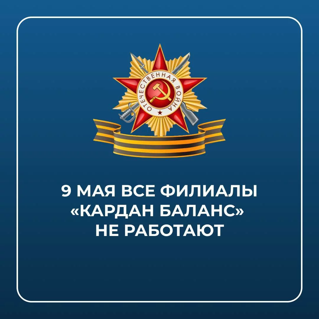В связи с праздником «День Победы» 9 мая все филиалы «Кардан Баланс» не будут работать.